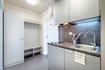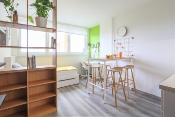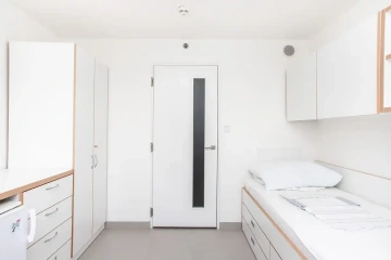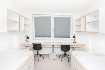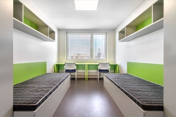 Ubytování nabízí moderní spolubydlení v pokojích nebo apartmánech dle Vašeho výběru. Apartmány se skládají ze dvou dvoulůžkových pokojů, společné předsíně, kuchyňky, koupelny se sprchovým koutem a zvlášť toalety. Samostatné jednolůžkové nebo dvoulůžkový pokoje mají předsíň, ledničku, koupelnu, zvlášť toaletu a kuchyňku mají sdílenou na patře. Apartmány/pokoje jsou plně vybavené – každý student má k dispozici vlastní postel, židli, psací stůl a dostatek úložného prostoru. Cena ubytování na osobu je od 390€/měsíc.